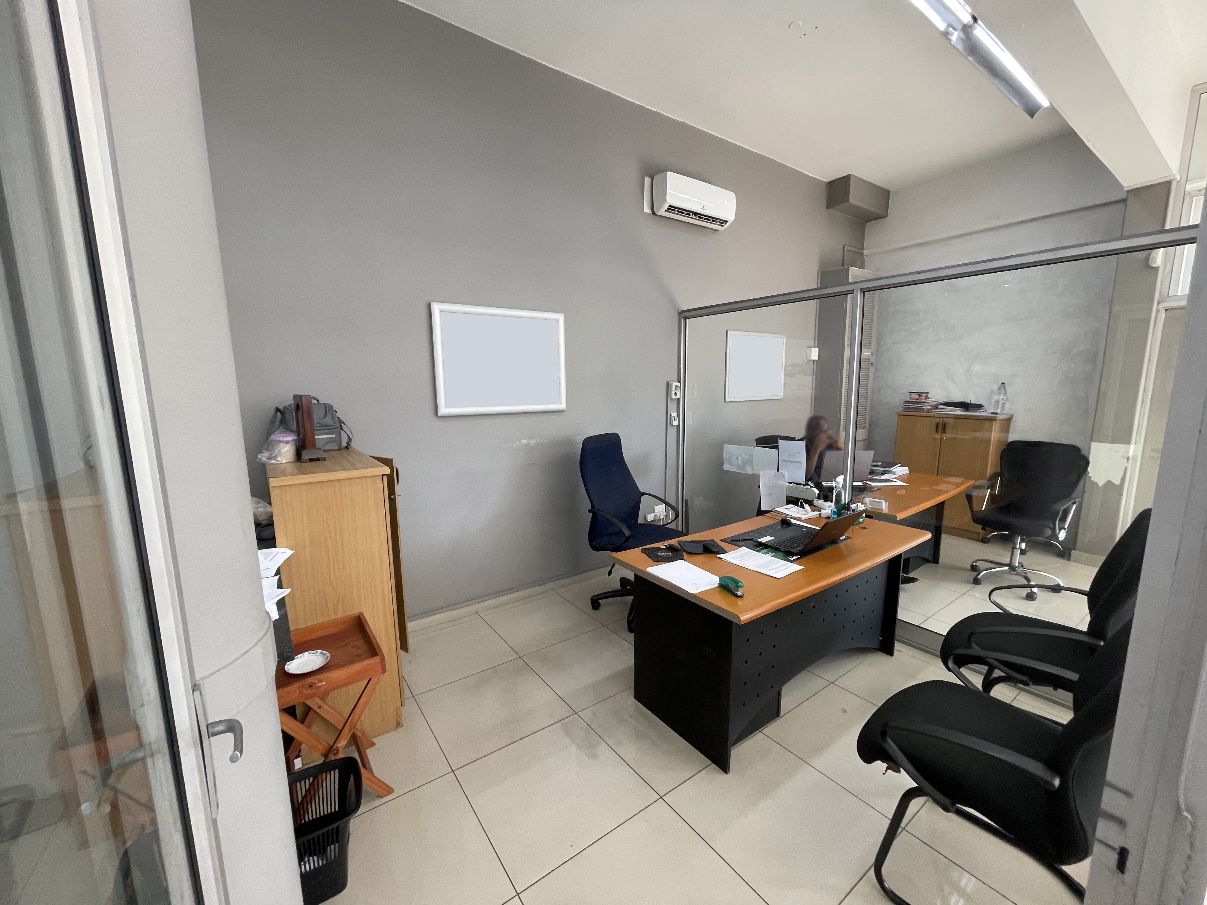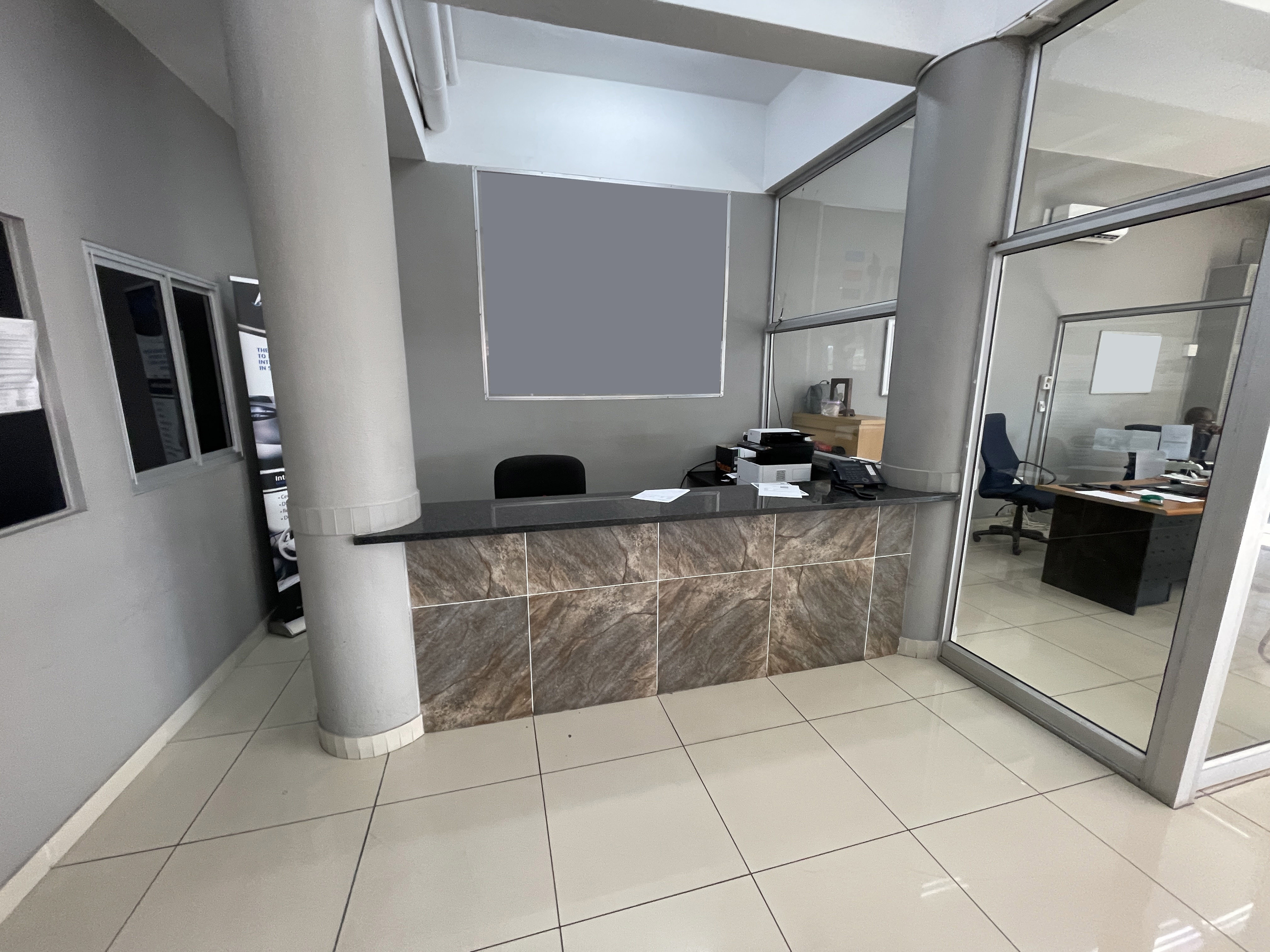 Additional internal features comprise a welcoming reception area, five air-conditioned offices ideal for administrative or managerial functions, a dedicated storage room, a convenient kitchenette, and a toilet facility. The tiled flooring throughout the unit enhances its professional appeal and provides easy maintenance.